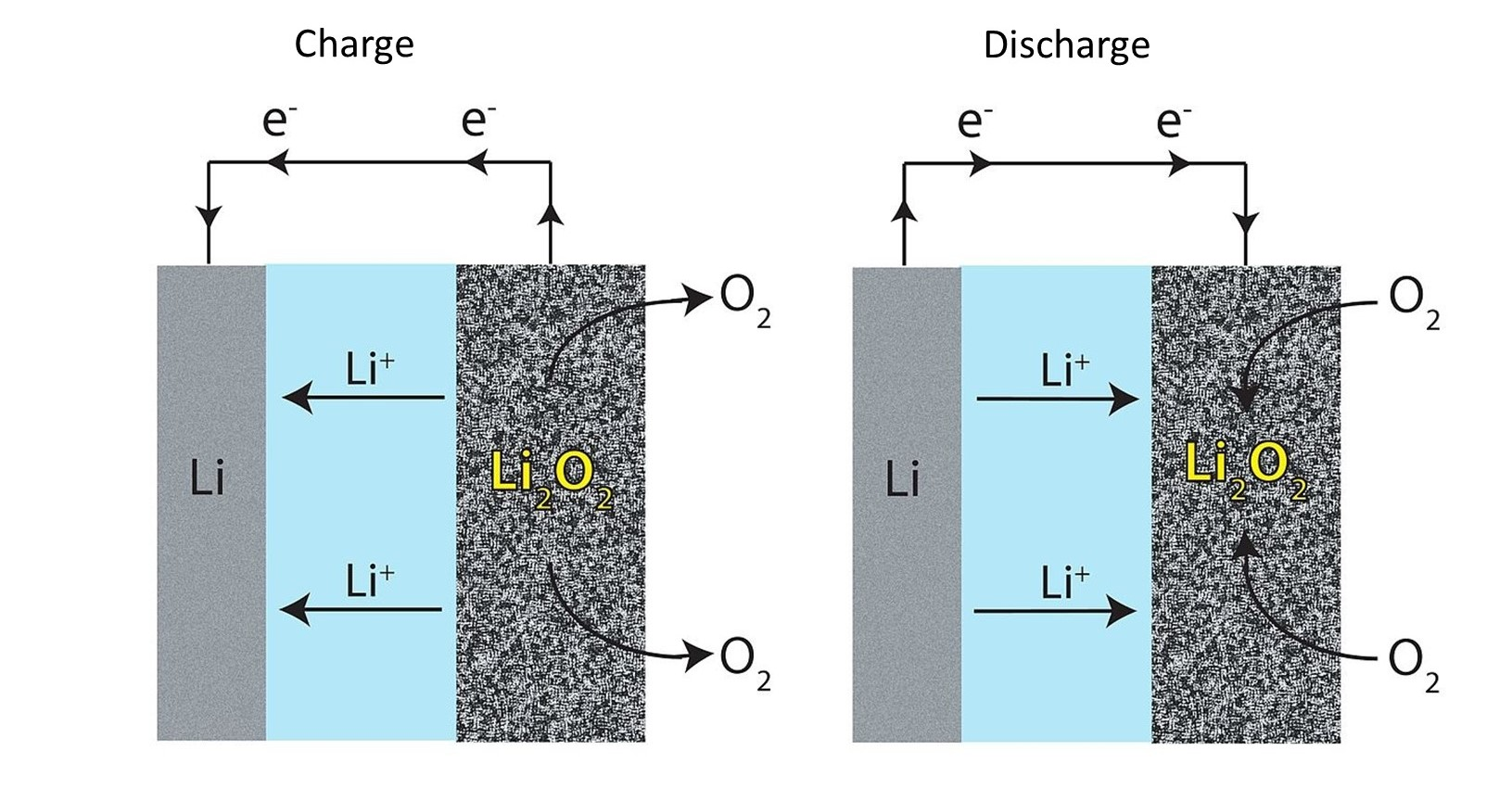 The O2 molecules react with the positively charged lithium ions to form a white, solid granular material known as lithium peroxide (Li2O2). Electric energy is then created by the electrons drawn from the electrode.