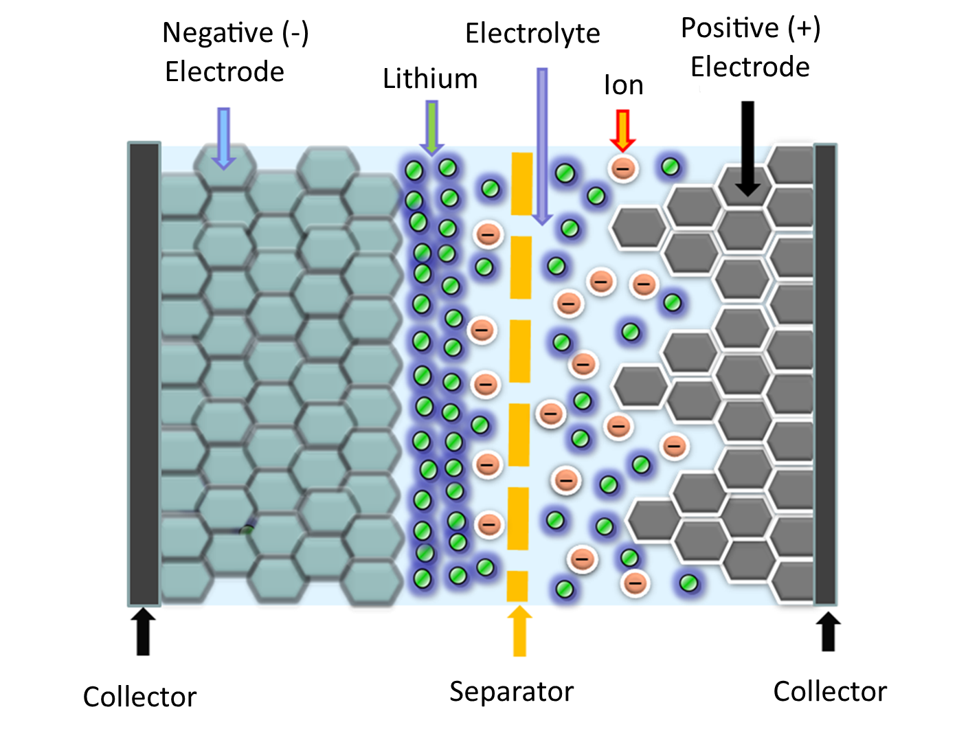 As with a conventional lithium-ion battery, both electrodes transfer charge-carrying, lithium ions between each other. It also has a polymer separator between the two electrodes, which also contain electrolyte. A polymer separator can act as a safety factor by shutting down the battery if it starts overheating during charging or discharging.